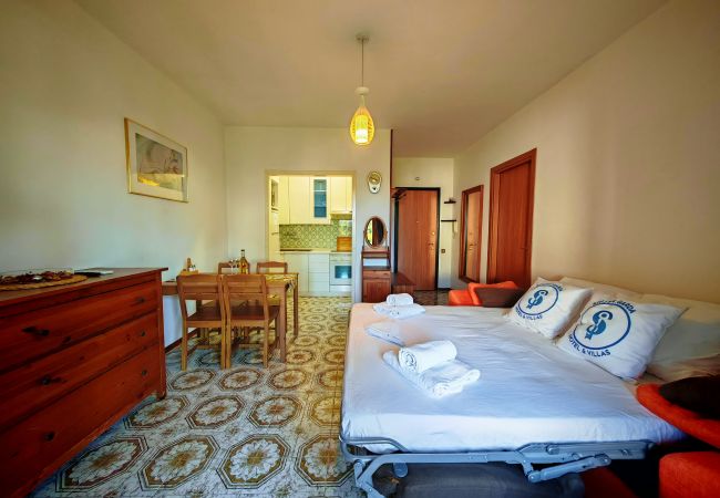 L’appartamento ha una camera matrimoniale e un divano letto doppio in salotto, può quindi ospitare fino a 4 persone. Ha uno spazioso e romantico balcone dotata di tavolino, che si affaccia sul giardino. Potrete inoltre usufruire della piscina in condivisione del residence.