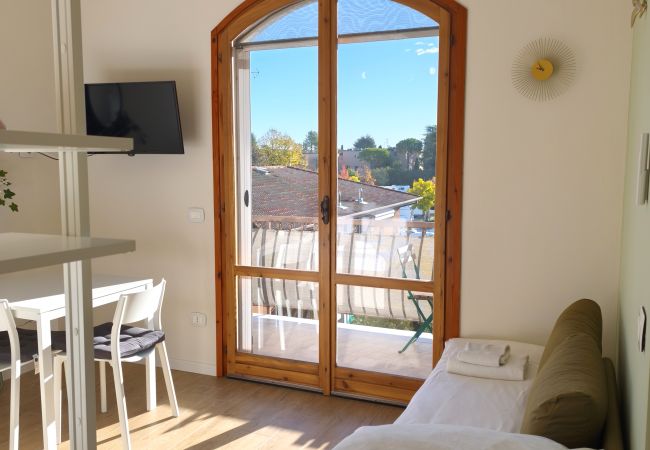 Die Wohnung verfügt über ein Doppelschlafzimmer und ein Doppelschlafsofa im Wohnzimmer und kann daher bis zu 4 Personen beherbergen. Sie hat einen geräumigen und romantischen Balkon mit einem Tischchen, der auf den Garten ausgerichtet ist. Sie können auch den gemeinschaftlichen Pool der Residenz nutzen.