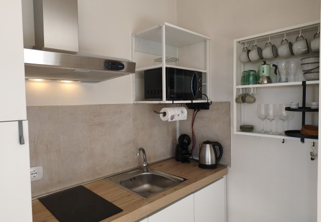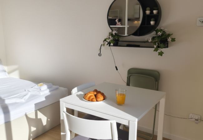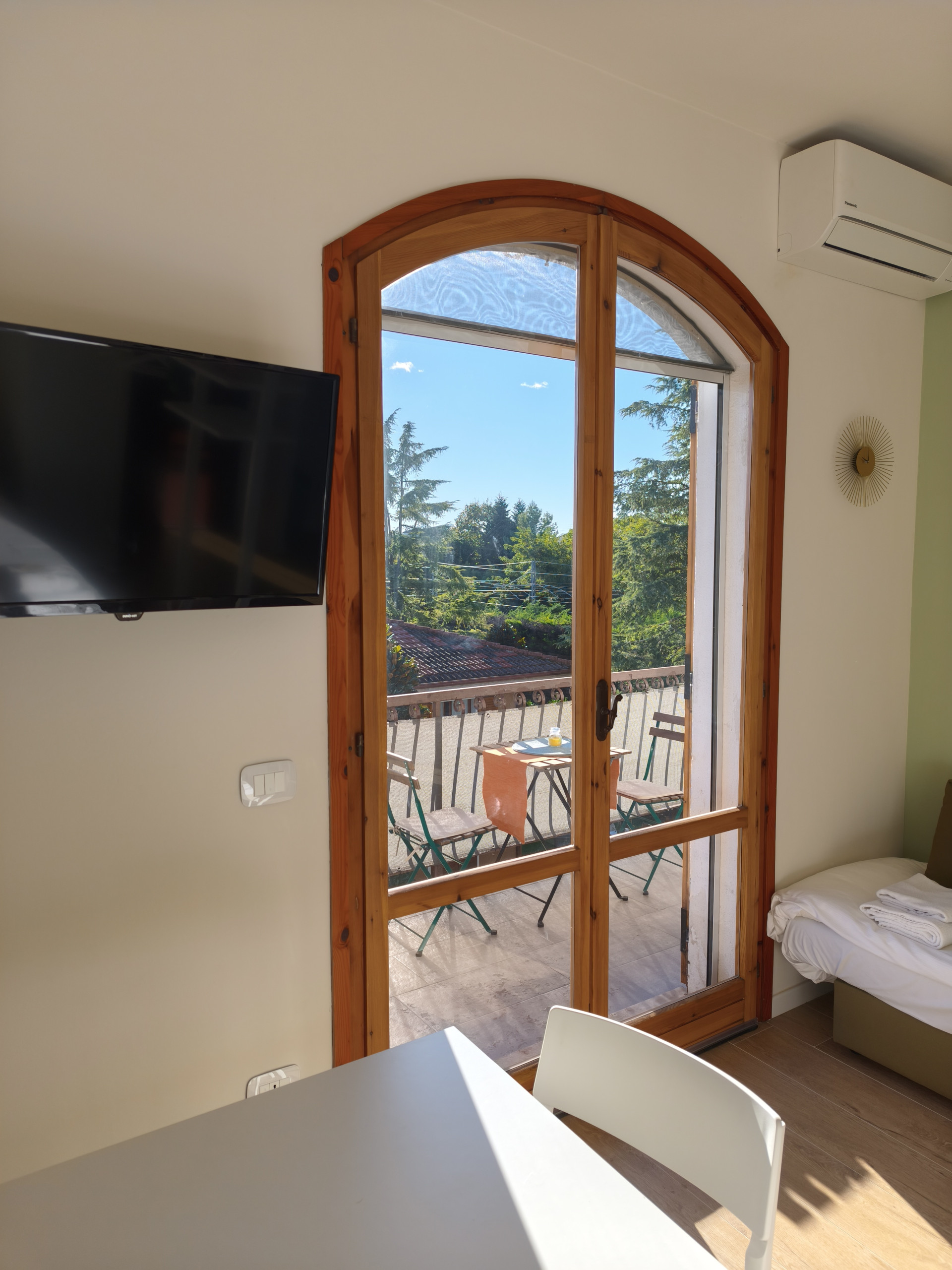 L'appartement dispose d'une chambre matrimoniale et d'un canapé-lit double dans le salon, pouvant donc accueillir jusqu'à 4 personnes. Il possède un balcon spacieux et romantique équipé d'une petite table, donnant sur le jardin. Vous pourrez également profiter de la piscine partagée de la résidence.